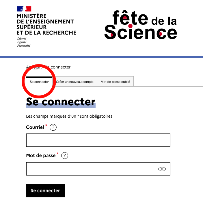 - Rendez-vous sur l’adresse : https://www.fetedelascience.fr/user/login