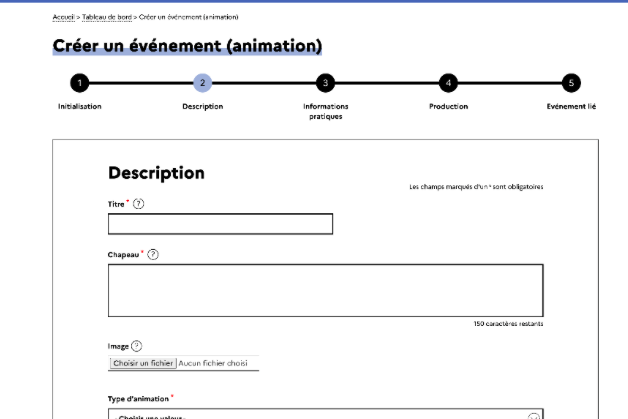 L’étape de description permet de remplir les champs relatifs aux informations liées à votre événement. Si vous avez utilisé l’option “Reconduction d’un événement”, certains champs seront déjà renseignés, mais vous pourrez les modifier si nécessaire.