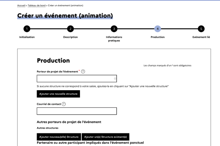 Cette quatrième étape permet d’ajouter des informations liées aux structures impliquées dans l’organisation de l’événement :
